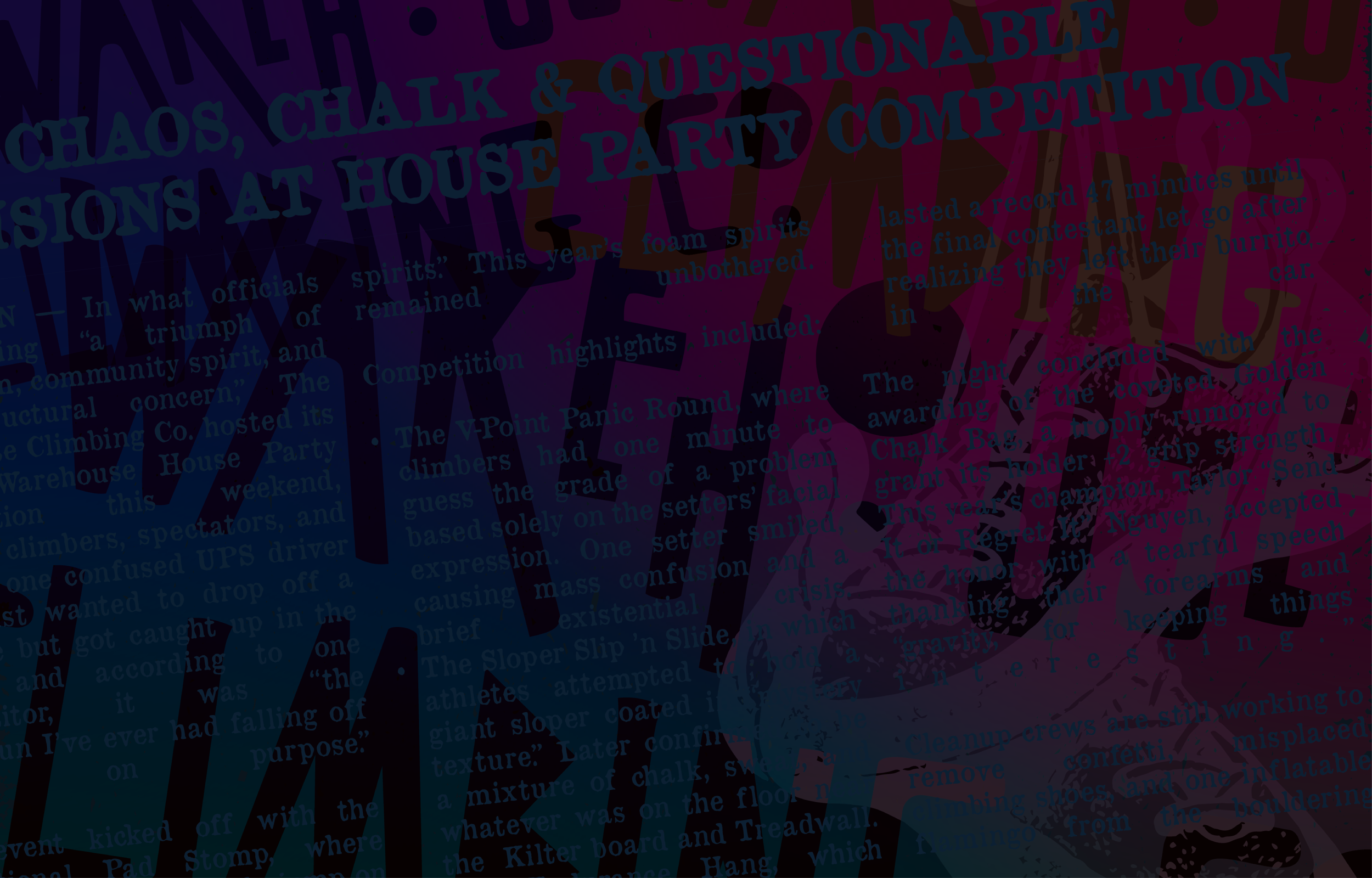 Every anniversary deserves a little chaos, and on Saturday, May 9th, the Warehouse celebrates its own the only way we know how: by dropping the normal gym act and unleashing our alter ego -the 4th Annual House Party Competition. Climbers from everywhere roll in to throw down, hang out, and get swept up in the kind of madness that only happens once a year.